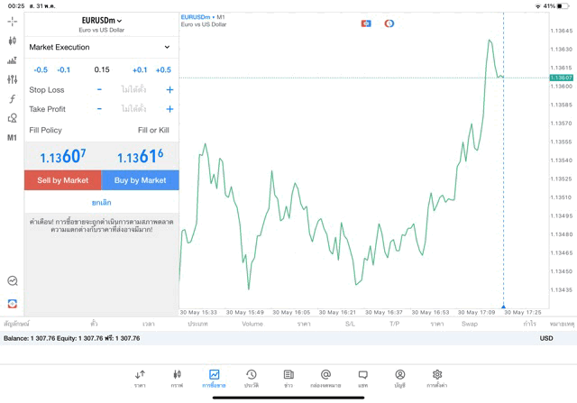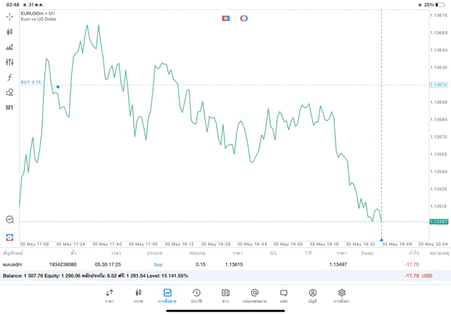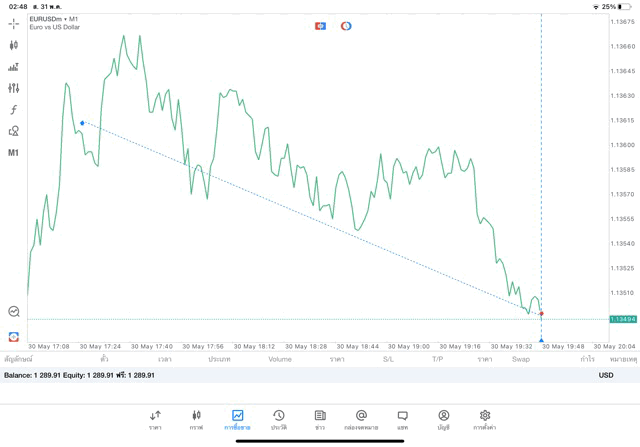 การเทรด forex EURUSD บนแอพเล่นหุ้น MT5 เริ่มแล้ว ติดลบก่อน เมื่อเวลาผ่านไป ราคาเปลี่ยนแปลง ผลการลงทุนอาจติดลบหรือได้บวกกำไร