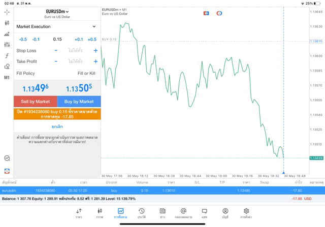 กรอกจำนวน lot ที่นักลงทุนต้องการลงทุน เช่น 0.15 lot แล้วคลิ๊กปุ่ม Buy by market หรือ ปุ่ม Sell by market,EURUSD หมายถึง เงิน Euro แลกเปลี่ยน เงิน US Dollar