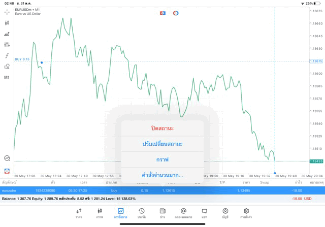 -17.70$ เปิดการเทรดไว้ต่อ หรือ ปิดการเทรดครั้งนี้เลย ได้เงินกำไรเข้าบัญชีเทรด ถ้ายังไม่ปิด ราคาเปลี่ยนแปลง ผลการลงทุนยังเปลี่ยนแปลง เช่น กำไรลดลง หรือ อาจเพิ่มขึ้น หรือ กลับไปติดลบ