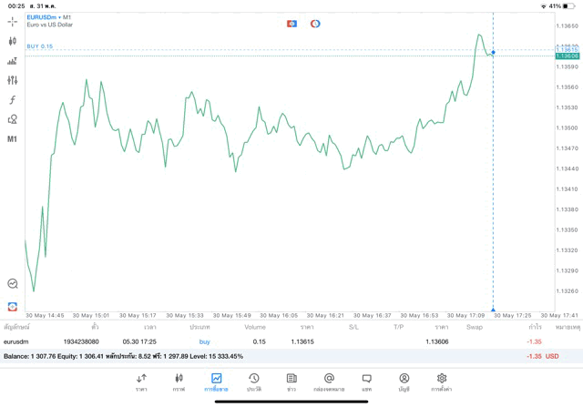 การเทรด forex EURUSD 0.15 lot บนแอพเล่นหุ้น MT5 หรือ Meta Trader 5 exness