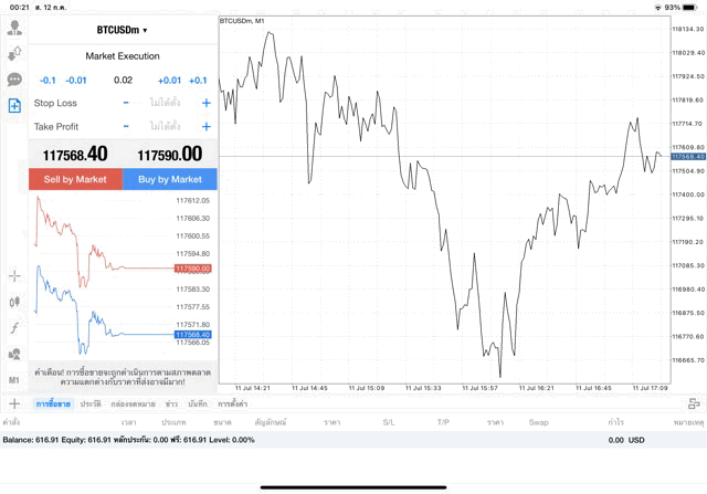 กรอกจำนวน lot ที่นักลงทุนต้องการลงทุน เช่น 0.02 lot แล้วคลิ๊กปุ่ม Buy by market หรือ ปุ่ม Sell by market, BTCUSD หมายถึง เงินดิจิตัล Bitcoin แลกเปลี่ยน เงิน US Dollar