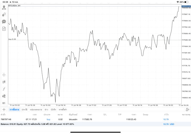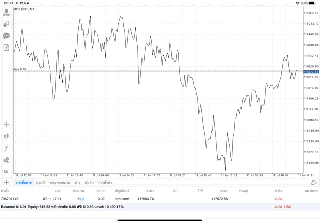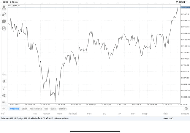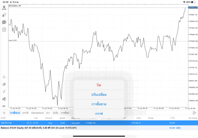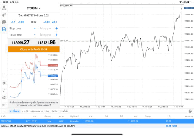 การเทรด Crypto BTCUSD บนแอพเล่นหุ้น MT4 เริ่มแล้ว ติดลบก่อน เมื่อเวลาผ่านไป ราคาเปลี่ยนแปลง ผลการลงทุนอาจติดลบหรือได้บวกกำไร