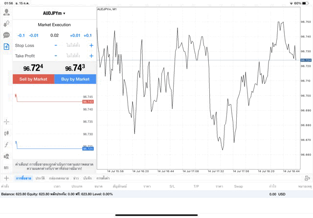 กรอกจำนวน lot เช่น 0.02 lot เลือกคลิ๊กปุ่ม Buy by market หรือ Sell by market , AUDJPY หมายถึง เงิน Australian Dollar แลกเปลี่ยน เงิน Japanese Yen