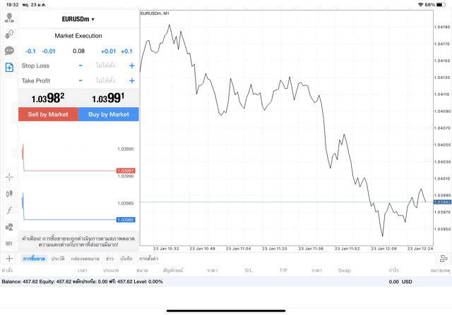 กรอกจำนวน lot ที่นักลงทุนต้องการลงทุน เช่น 0.08 lot แล้วคลิ๊กปุ่ม Buy by market หรือ ปุ่ม Sell by market,EURUSD หมายถึง เงิน Euro แลกเปลี่ยน เงิน US Dollar