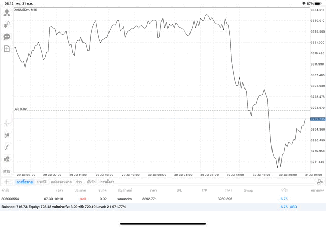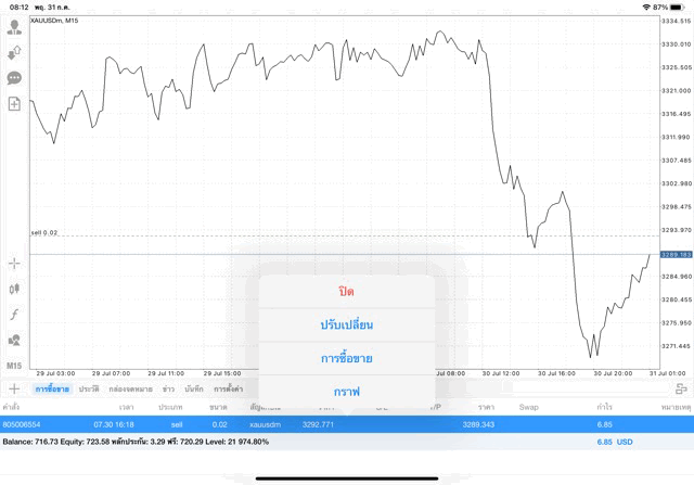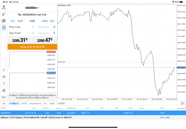 +6.75$ เปิดการเทรดไว้ต่อ หรือ ปิดการเทรดครั้งนี้เลย ได้เงินกำไรเข้าบัญชีเทรด ถ้ายังไม่ปิด ราคาเปลี่ยนแปลง ผลการลงทุนยังเปลี่ยนแปลง เช่น กำไรลดลง หรือ อาจเพิ่มขึ้น หรือ กลับไปติดลบ