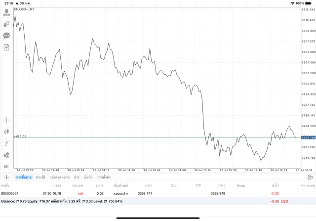 การเทรดทองคำ หรือ XAUUSD 0.02 lot บนแอพเล่นหุ้น MT4 หรือ Meta Trader 4 exness