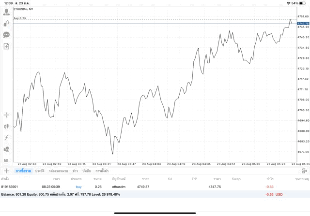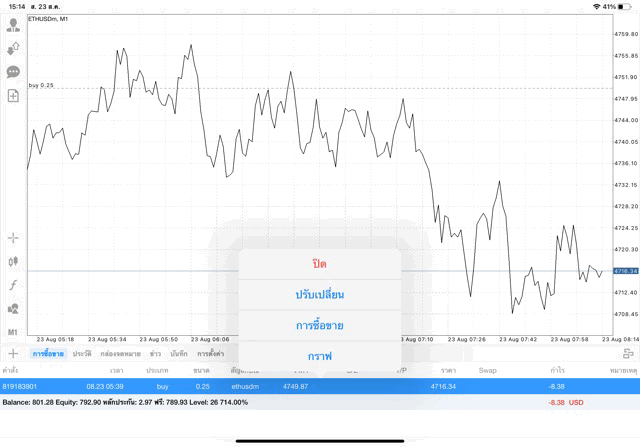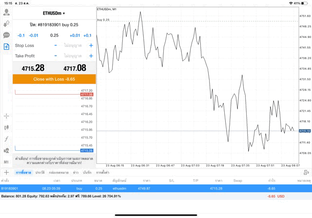 การเทรด Crypto ETHUSD 0.25 lot บนแอพเล่นหุ้น MT4 หรือ Meta Trader 4