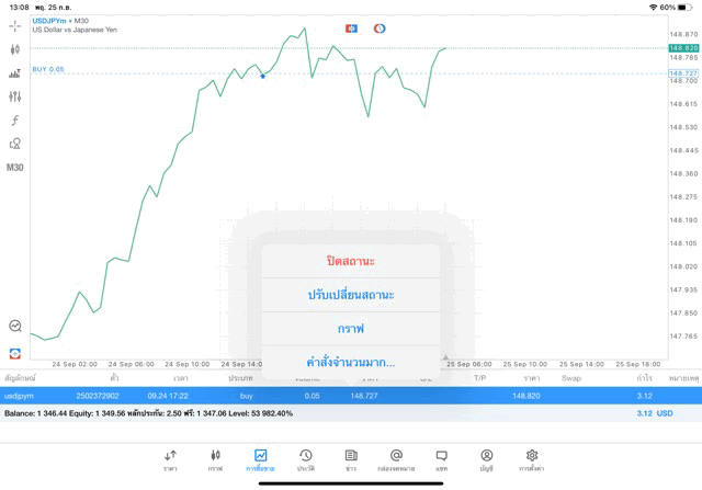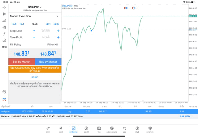 การเทรด forex USDJPY 0.05 lot บนแอพเล่นหุ้น MT5 หรือ Meta Trader 5