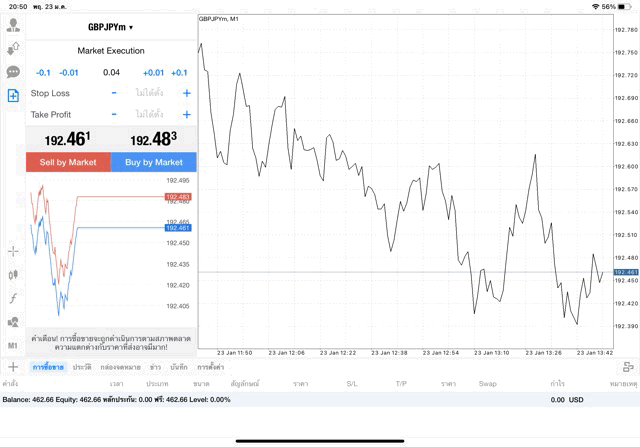 กรอกจำนวน lot ที่นักลงทุนต้องการลงทุน เช่น 0.04 lot แล้วคลิ๊กปุ่ม Buy by market หรือ ปุ่ม Sell by market, GBPJPY หมายถึง เงิน Great Britain Pounds แลกเปลี่ยน เงิน Japanese Yen