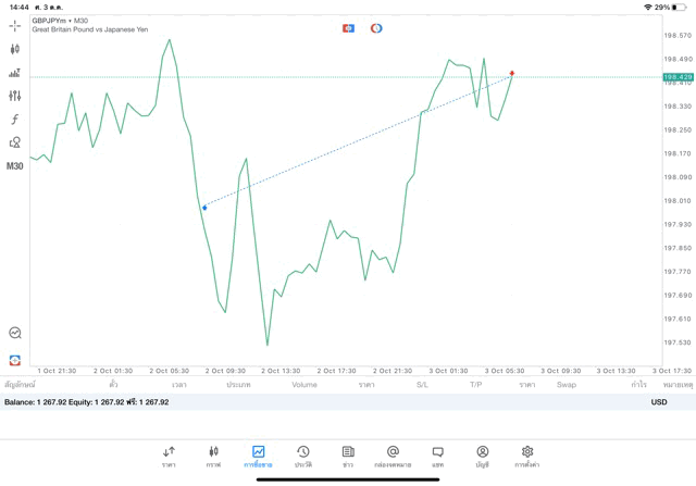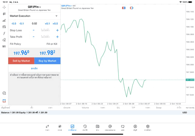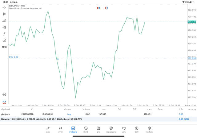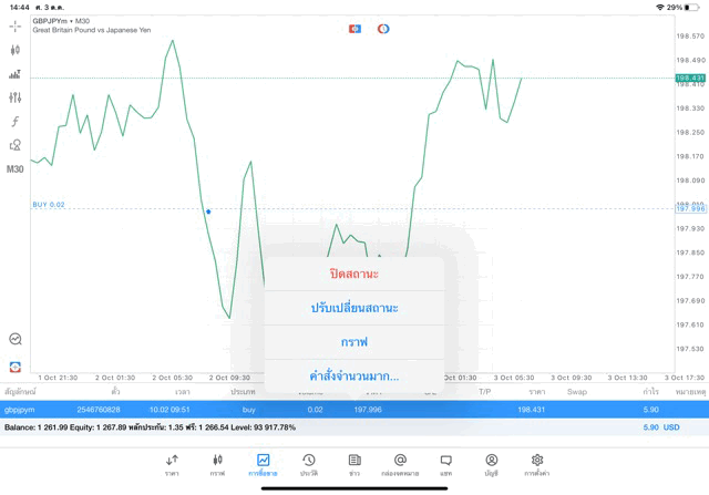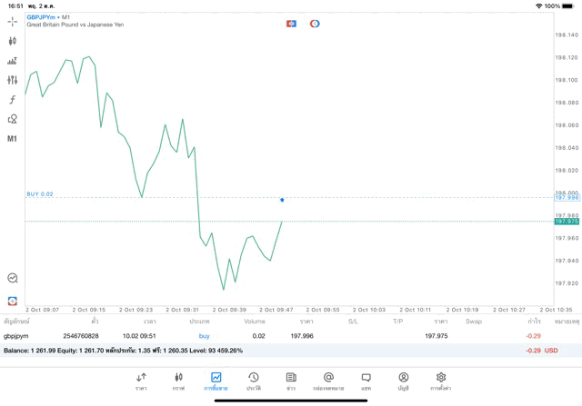 การเทรด forex GBPJPY บนแอพเล่นหุ้น MT5 เริ่มแล้ว ติดลบก่อน เมื่อเวลาผ่านไป ราคาเปลี่ยนแปลง ผลการลงทุนอาจติดลบหรือได้บวกกำไร