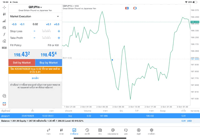 การเทรด forex GBPJPY 0.02 lot บนแอพเล่นหุ้น MT5 หรือ Meta Trader 5