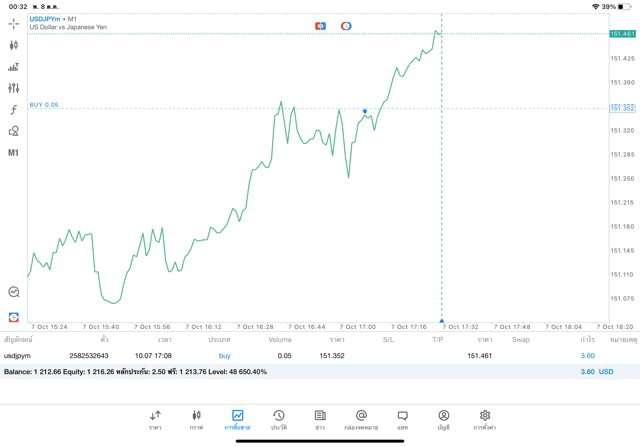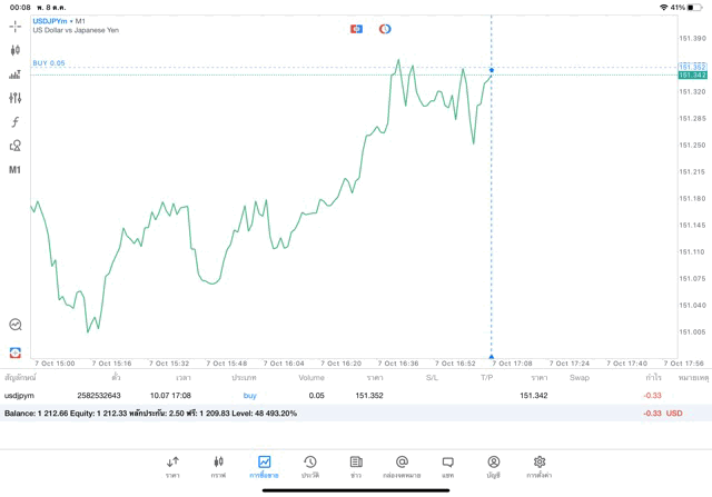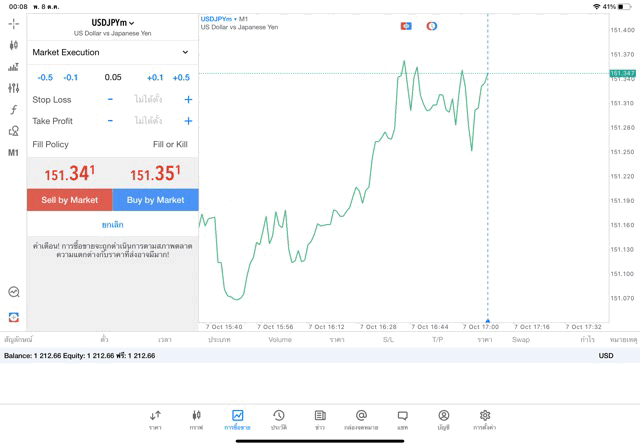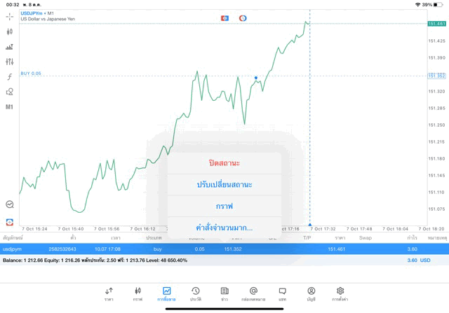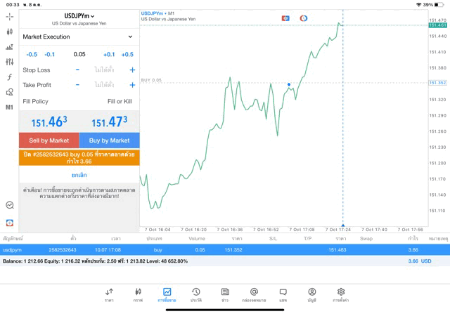 การเทรด forex USDJPY 0.05 lot บนแอพเล่นหุ้น MT5 หรือ Meta Trader 5