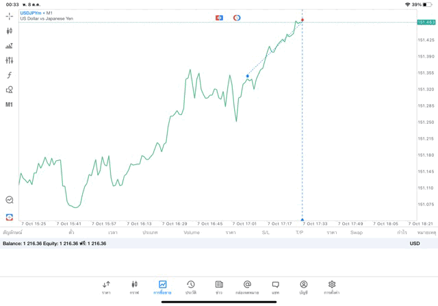 การเทรด forex USDJPY บนแอพเล่นหุ้น MT5 เริ่มแล้ว ติดลบก่อน เมื่อเวลาผ่านไป ราคาเปลี่ยนแปลง ผลการลงทุนอาจติดลบหรือได้บวกกำไร