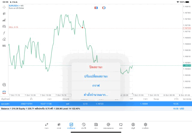 +19.35$ เปิดการเทรดไว้ต่อ หรือ ปิดการเทรดครั้งนี้เลย ได้เงินกำไรเข้าบัญชีเทรด ถ้ายังไม่ปิด ราคาเปลี่ยนแปลง ผลการลงทุนยังเปลี่ยนแปลง เช่น กำไรลดลง หรือ อาจเพิ่มขึ้น หรือ กลับไปติดลบ