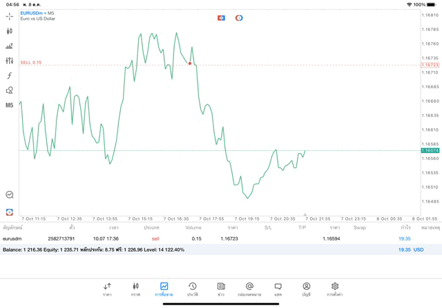 การเทรด forex EURUSD 0.15 lot บนแอพเล่นหุ้น MT5 หรือ Meta Trader 5 exness