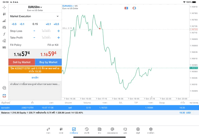 กรอกจำนวน lot ที่นักลงทุนต้องการลงทุน เช่น 0.15 lot แล้วคลิ๊กปุ่ม Buy by market หรือ ปุ่ม Sell by market,EURUSD หมายถึง เงิน Euro แลกเปลี่ยน เงิน US Dollar