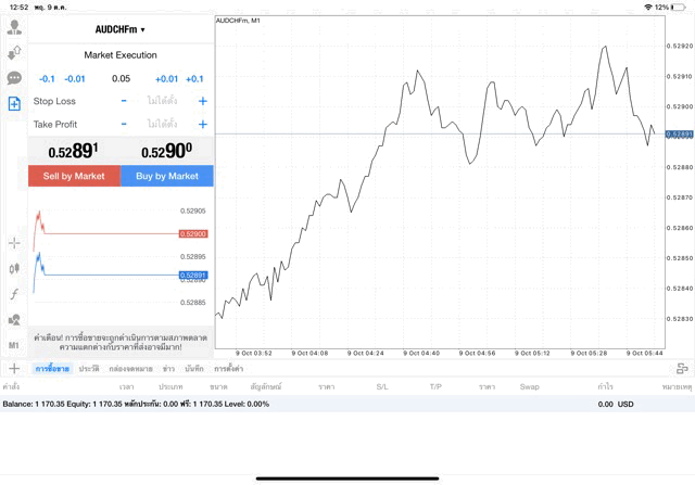 กรอกจำนวน lot ที่นักลงทุนต้องการลงทุน เช่น 0.05 lot แล้วคลิ๊กปุ่ม Buy by market หรือ ปุ่ม Sell by market, AUDCHF หมายถึง เงิน Australian dollar แลกเปลี่ยน เงิน Franc Swiss