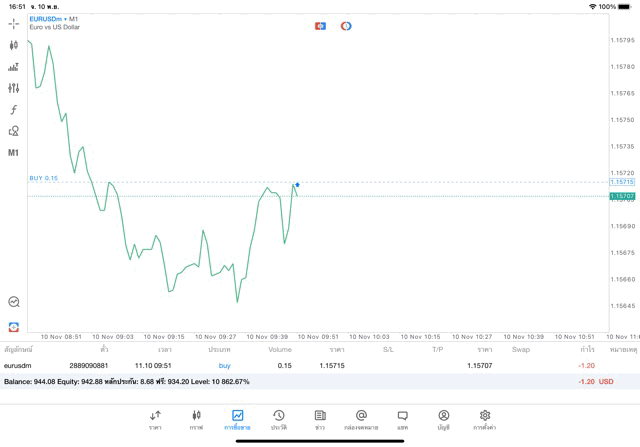 การเทรด forex EURUSD บนแอพเล่นหุ้น MT5 เริ่มแล้ว ติดลบก่อน เมื่อเวลาผ่านไป ราคาเปลี่ยนแปลง ผลการลงทุนอาจติดลบหรือได้บวกกำไร