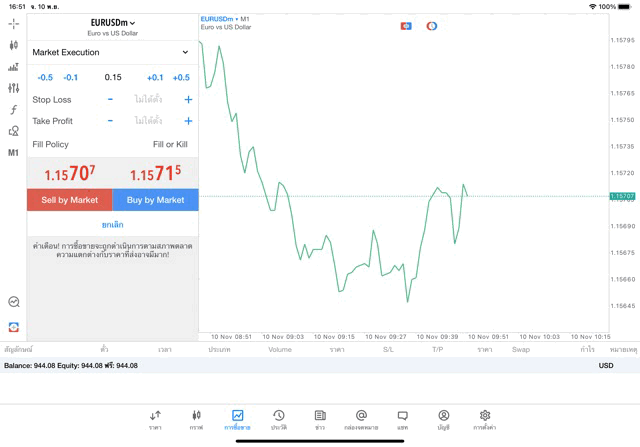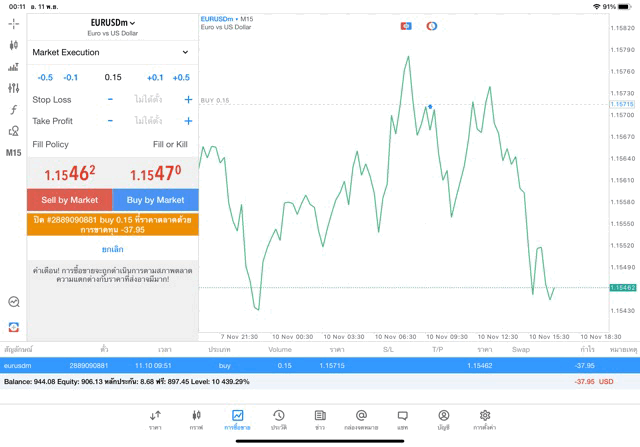 กรอกจำนวน lot ที่นักลงทุนต้องการลงทุน เช่น 0.15 lot แล้วคลิ๊กปุ่ม Buy by market หรือ ปุ่ม Sell by market,EURUSD หมายถึง เงิน Euro แลกเปลี่ยน เงิน US Dollar