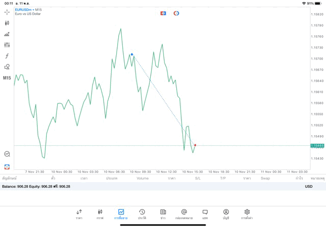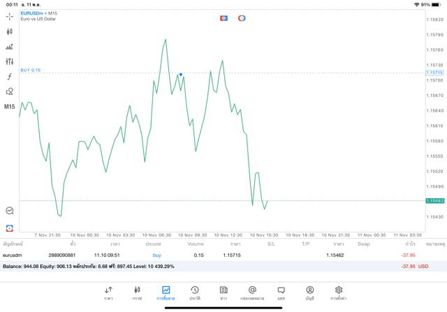 การเทรด forex EURUSD 0.15 lot บนแอพเล่นหุ้น MT5 หรือ Meta Trader 5 exness