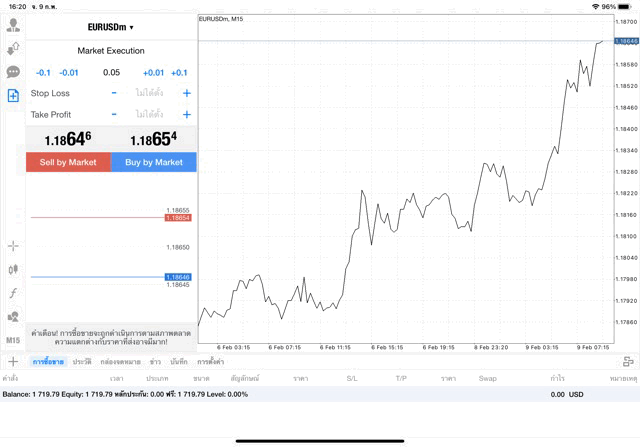 กรอกจำนวน lot ที่นักลงทุนต้องการลงทุน เช่น 0.05 lot แล้วคลิ๊กปุ่ม Buy by market หรือ ปุ่ม Sell by market,EURUSD หมายถึง เงิน Euro แลกเปลี่ยน เงิน US Dollar