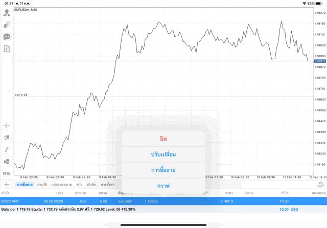 +13.15$ เปิดการเทรดไว้ต่อ หรือ ปิดการเทรดครั้งนี้เลย ได้เงินกำไรเข้าบัญชีเทรด ถ้ายังไม่ปิด ราคาเปลี่ยนแปลง ผลการลงทุนยังเปลี่ยนแปลง เช่น กำไรลดลง หรือ อาจเพิ่มขึ้น หรือ กลับไปติดลบ