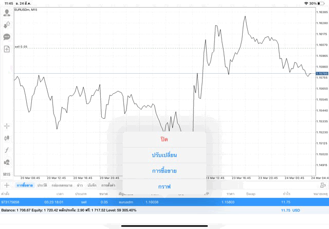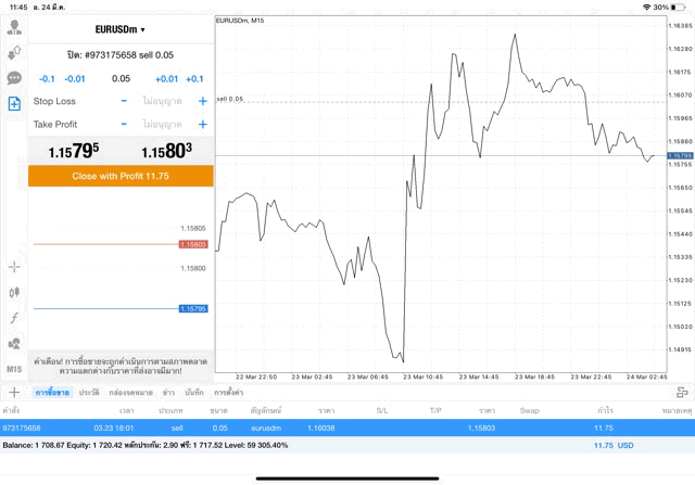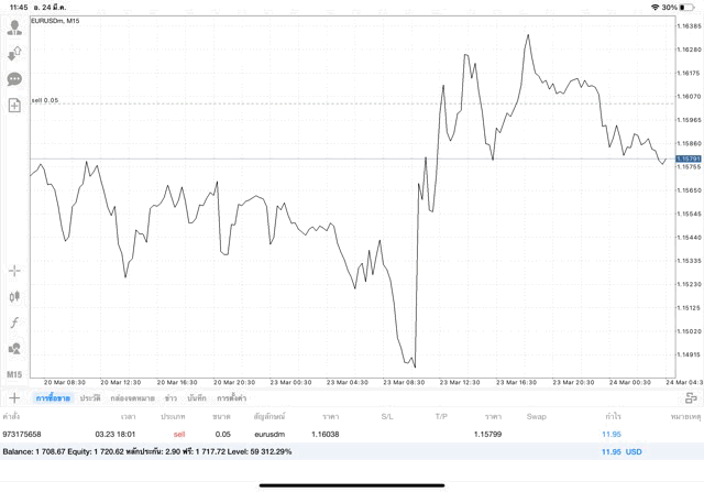 +11.95$ เปิดการเทรดไว้ต่อ หรือ ปิดการเทรดครั้งนี้เลย ได้เงินกำไรเข้าบัญชีเทรด ถ้ายังไม่ปิด ราคาเปลี่ยนแปลง ผลการลงทุนยังเปลี่ยนแปลง เช่น กำไรลดลง หรือ อาจเพิ่มขึ้น หรือ กลับไปติดลบ