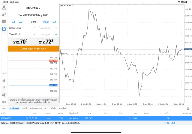 +1.66$ เปิดการเทรดไว้ต่อ หรือ ปิดการเทรดครั้งนี้เลย ได้เงินกำไรเข้าบัญชีเทรด ถ้ายังไม่ปิด ราคาเปลี่ยนแปลง ผลการลงทุนยังเปลี่ยนแปลง เช่น กำไรลดลง หรือ อาจเพิ่มขึ้น หรือ กลับไปติดลบ