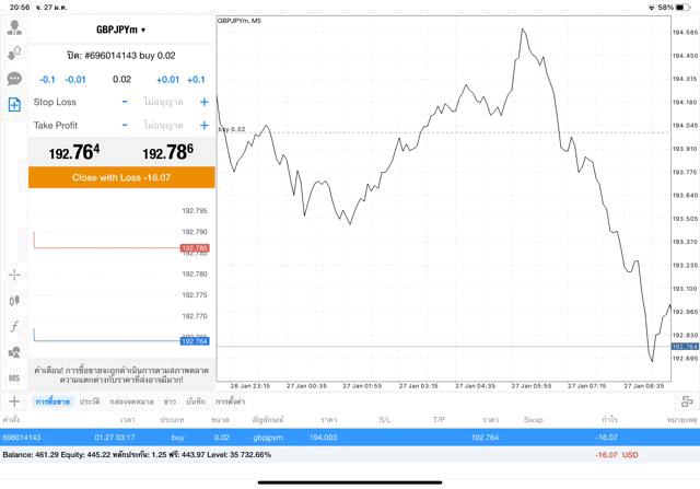 การเทรด forex GBPJPY 0.02 lot บนแอพเล่นหุ้น mt4 หรือ Meta trader 4