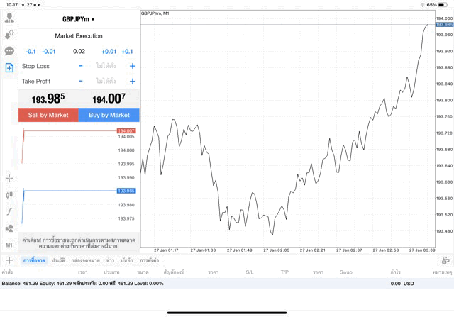 กรอกจำนวน lot ที่นักลงทุนต้องการลงทุน เช่น 0.02 lot แล้วคลิ๊กปุ่ม Buy by market หรือ ปุ่ม Sell by market, GBPJPY หมายถึง เงิน Great Britain Pounds แลกเปลี่ยน เงิน Japanese Yen