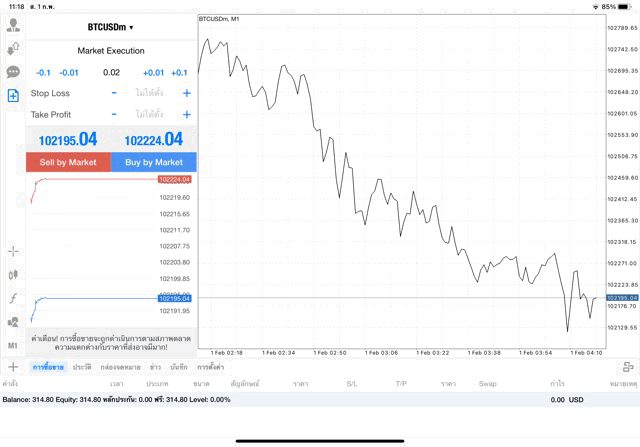 การเทรด Crypto BTCUSD 0.02 lot บนแอพเล่นหุ้น mt4 หรือ Meta trader 4