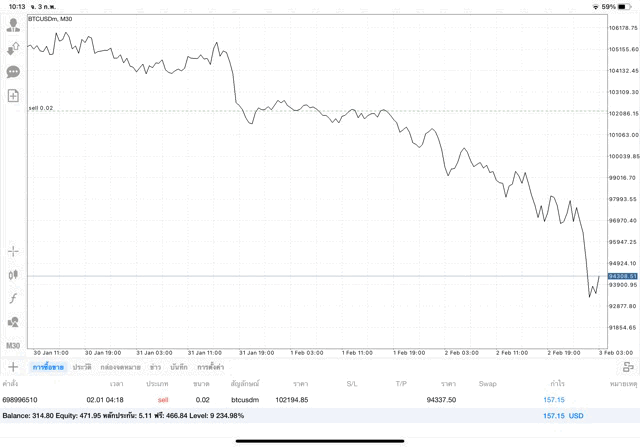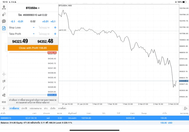 ได้กำไร +157.15$ เปิดการเทรดไว้ต่อ หรือ ปิดการเทรดครั้งนี้เลย ได้เงินกำไรเข้าบัญชีเทรด ถ้ายังไม่ปิด ราคาเปลี่ยนแปลง ผลการลงทุนยังเปลี่ยนแปลง เช่น กำไรลดลง หรือ อาจเพิ่มขึ้น หรือ กลับไปติดลบ