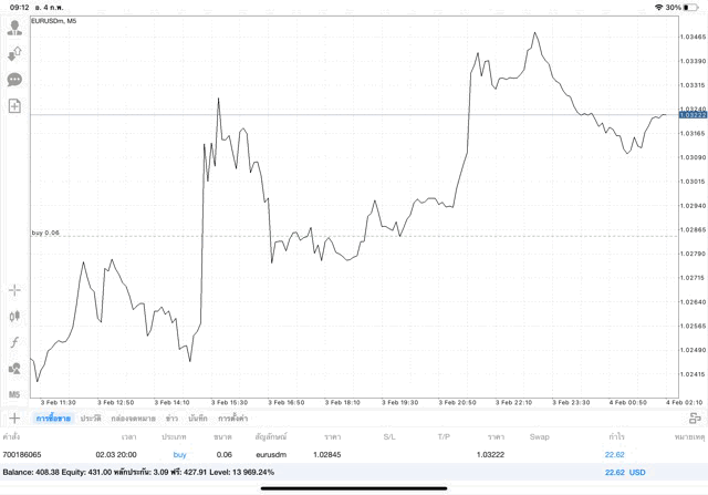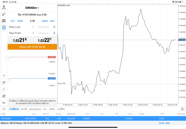 บวก +22.62 $ เปิดการเทรดไว้ต่อ หรือ ปิดการเทรดครั้งนี้เลย ได้เงินกำไรเข้าบัญชีเทรด ถ้ายังไม่ปิด ราคาเปลี่ยนแปลง ผลการลงทุนยังเปลี่ยนแปลง เช่น กำไรลดลง หรือ อาจเพิ่มขึ้น หรือ กลับไปติดลบ