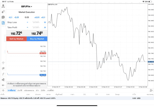 กรอกจำนวน lot ที่นักลงทุนต้องการลงทุน เช่น 0.03 lot แล้วคลิ๊กปุ่ม Buy by market หรือ ปุ่ม Sell by market, GBPJPY หมายถึง เงิน Great Britain Pounds แลกเปลี่ยน เงิน Japanese Yen