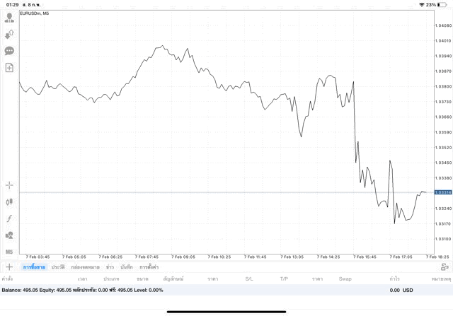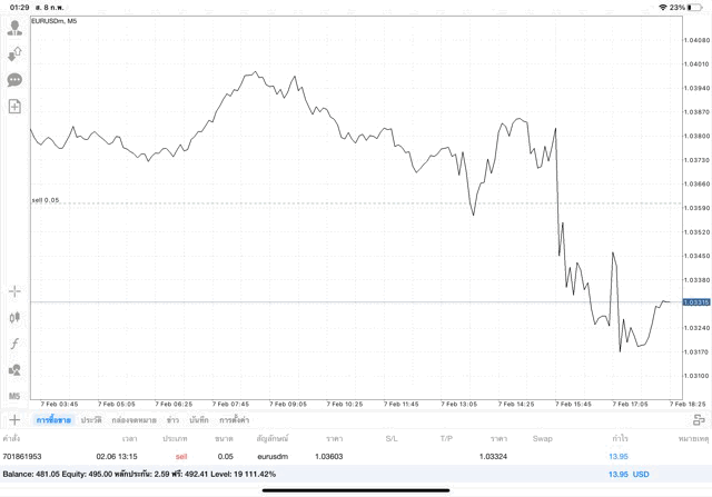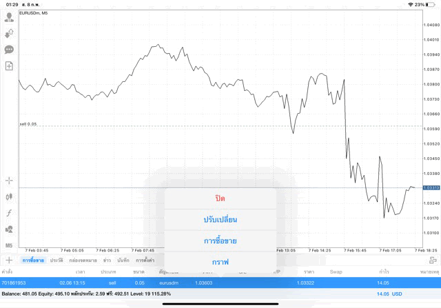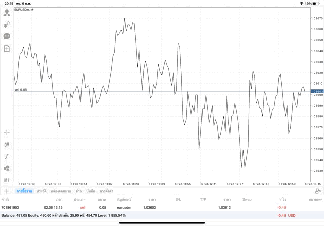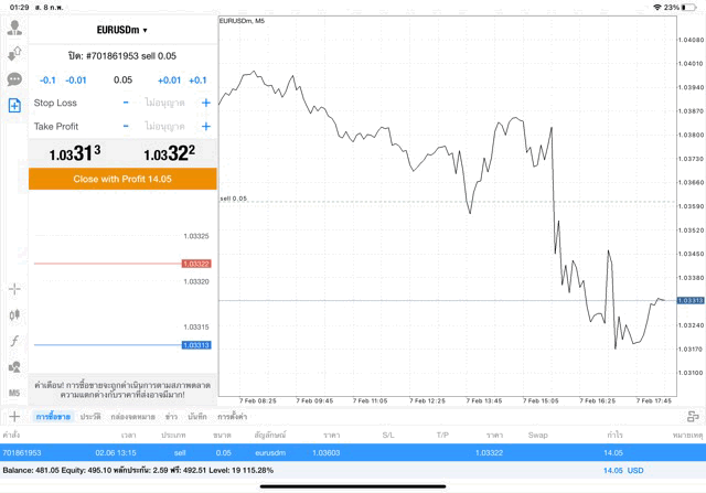 การเทรด forex EURUSD 0.05 lot บนแอพเล่นหุ้น mt4 หรือ Meta trader 4 exness