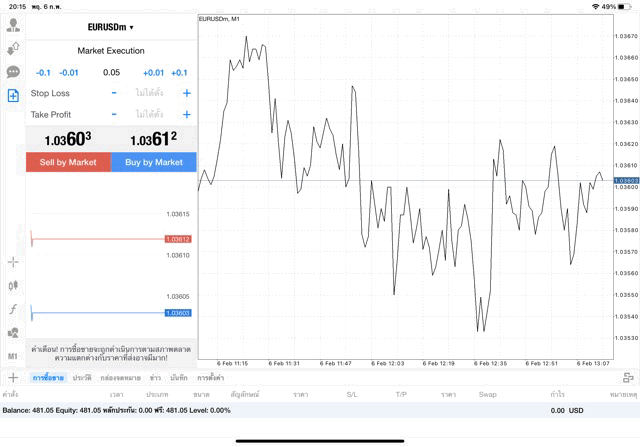 กรอกจำนวน lot ที่นักลงทุนต้องการลงทุน เช่น 0.05 lot แล้วคลิ๊กปุ่ม Buy by market หรือ ปุ่ม Sell by market,EURUSD หมายถึง เงิน Euro แลกเปลี่ยน เงิน US Dollar