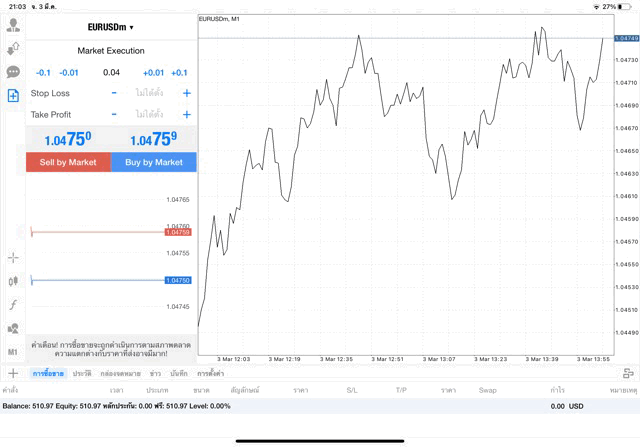 กรอกจำนวน lot ที่นักลงทุนต้องการลงทุน เช่น 0.04 lot แล้วคลิ๊กปุ่ม Buy by market หรือ ปุ่ม Sell by market,EURUSD หมายถึง เงิน Euro แลกเปลี่ยน เงิน US Dollar