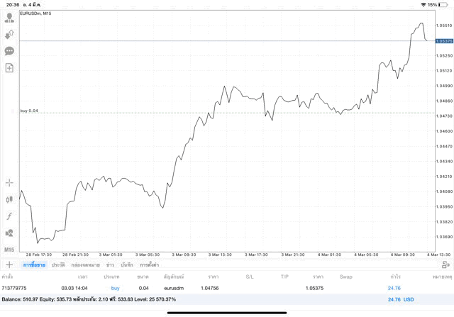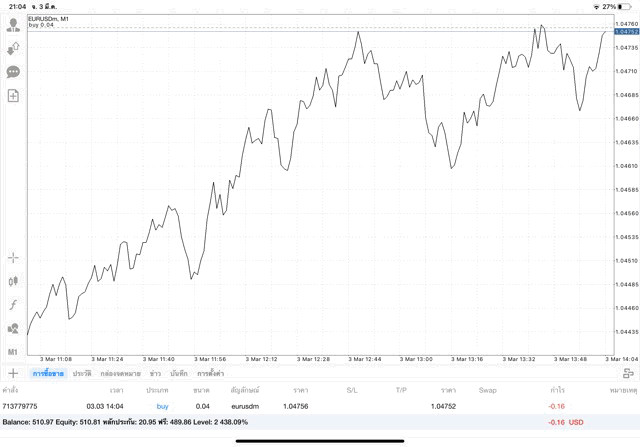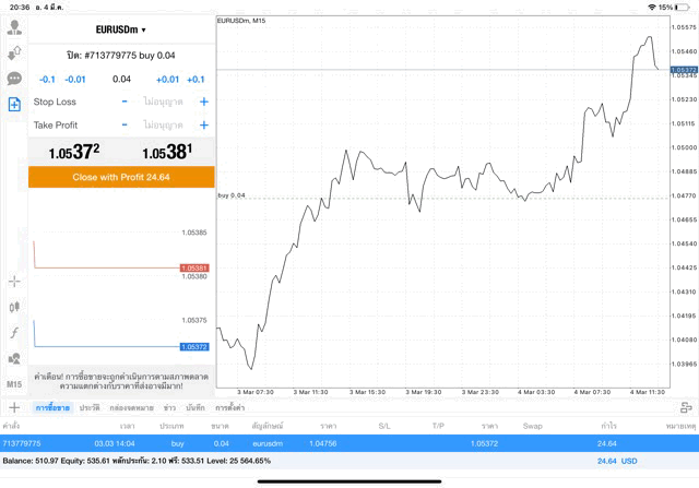 การเทรด forex EURUSD 0.04 lot บนแอพเล่นหุ้น MT4 หรือ Meta Trader 4 exness