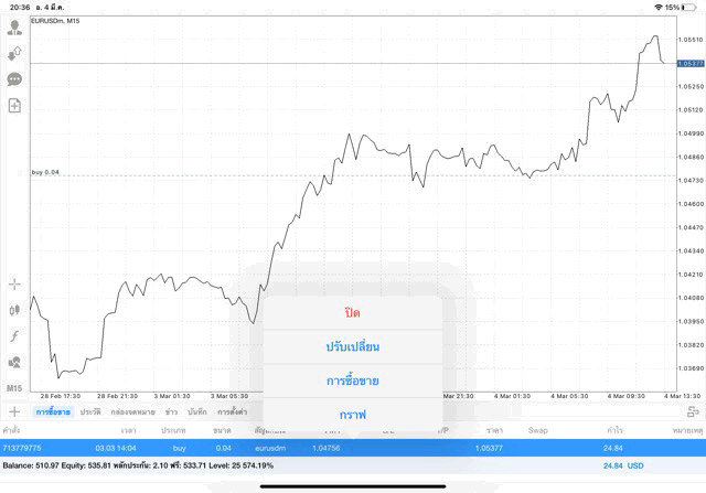 การเทรด forex EURUSD บนแอพเล่นหุ้น MT4 เริ่มแล้ว ติดลบก่อน เมื่อเวลาผ่านไป ราคาเปลี่ยนแปลง ผลการลงทุนอาจติดลบหรือได้บวกกำไร