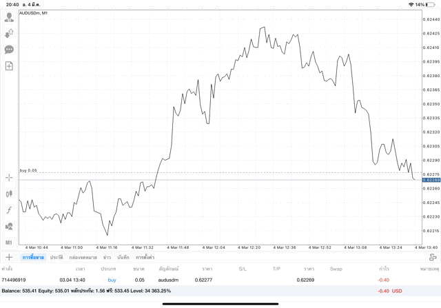 กรอกจำนวน lot เช่น 0.05 lot เลือกคลิ๊กปุ่ม Buy by market หรือ Sell by market , AUDUSD หมายถึง เงิน Australian Dollar แลกเปลี่ยน เงิน US Dollar